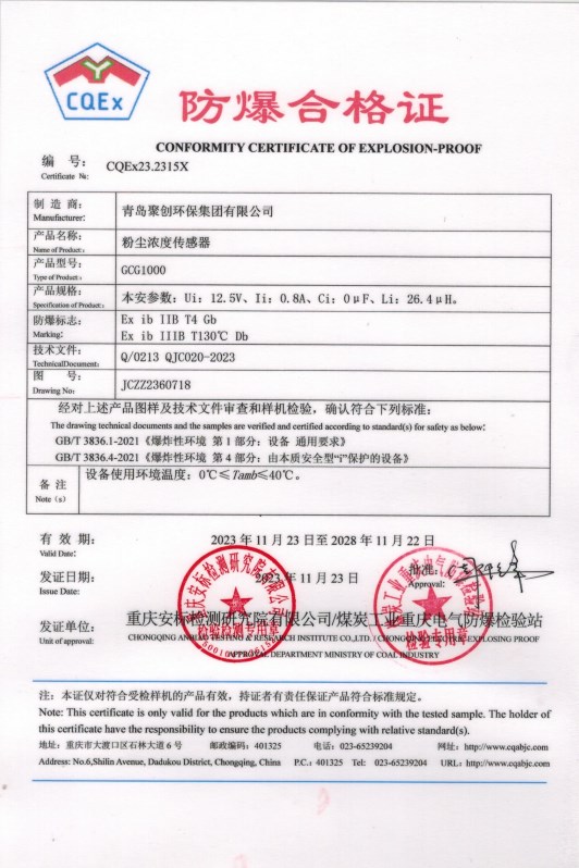 GCG - 1000 粉尘浓度传感器依据 MT163 - 1997《直读式粉主浓度测量仪表通用技术条件》设计制造,运用光散射原理,能够直接测量总粉尘浓度。该传感器固定安装于作业场所,测定数据可就地显示,同时输出与矿井安全检测系统相适配的频率或 RS485(二者任选其一),以供监测系统进行处理。其具备测量快速准确、检测灵敏度高、性能稳定、粉尘散射比例系数可设定、直接显示粉尘质量浓度等特点。