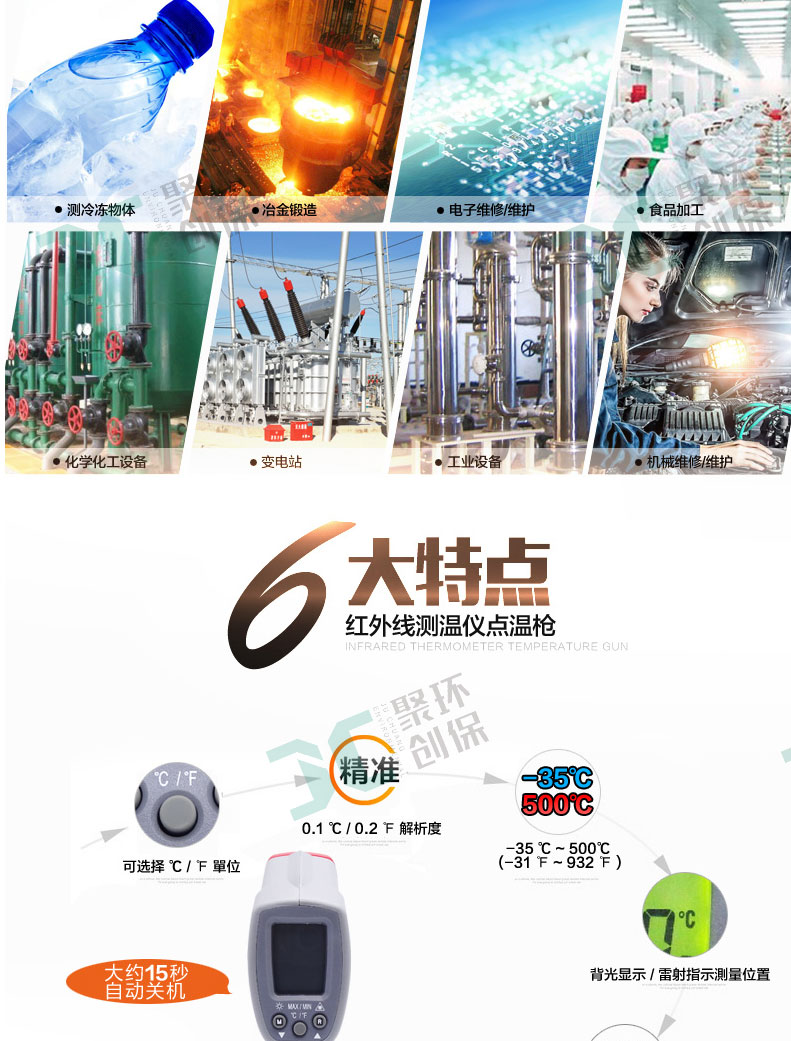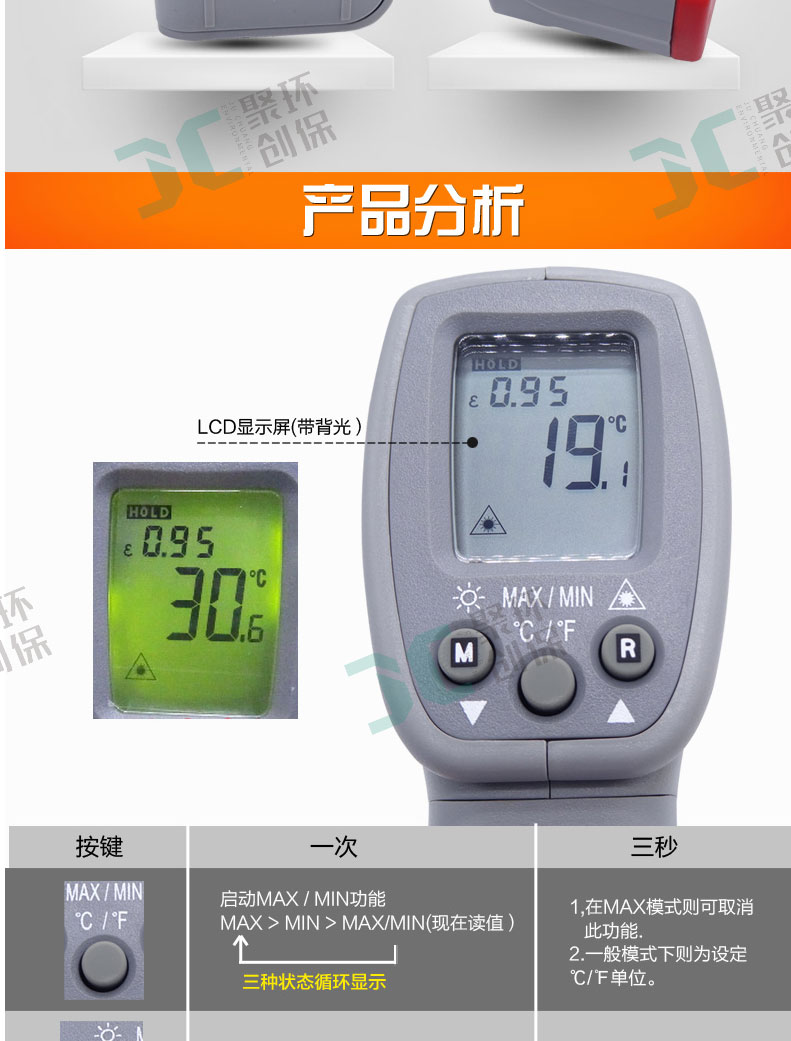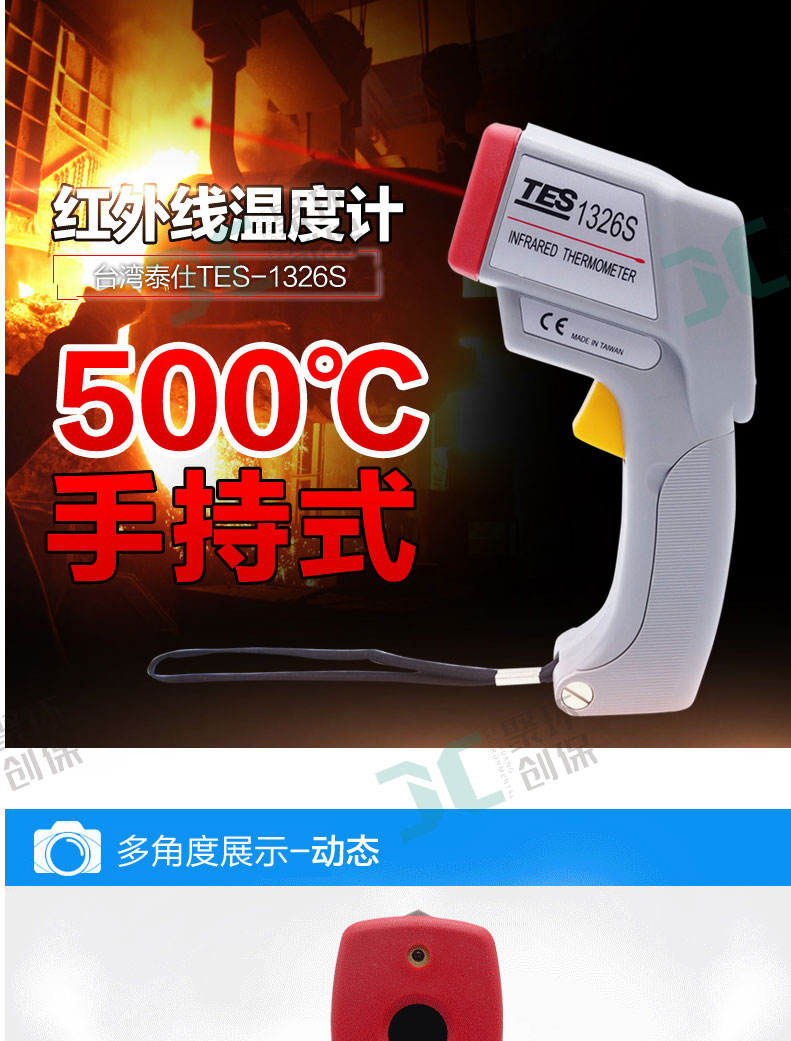 TES-1326S红外线测温仪可选择℃/℉单位 *大值、*小值功能 温度测量范围 -20℃~+500℃ 内装雷射指示光点、背光显示 距离与目标比 12:1; 25mm*小点尺寸 0.1℃/0.2℉分辨率 固定 0.95。