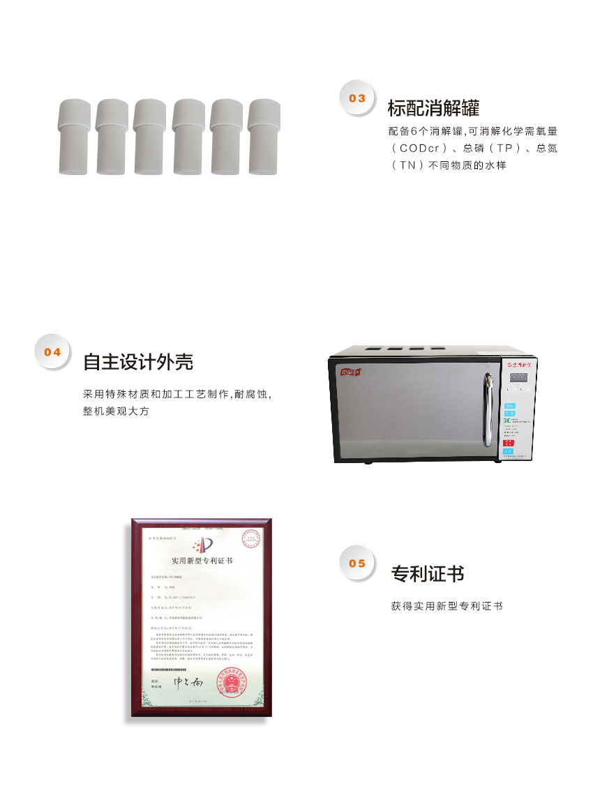 4、精密度:CODcr值在80—150mg/L时:室内相对标准偏差≤4.3%,室间相对标准偏差≤5.0%, TP、TN能满足国家标准(GB11889-11915-89)水质词汇(第3-7部分)与分析方法的要求
