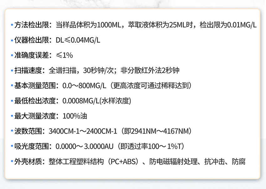 | 基本测量范围 | 0.12 mg/L~100mg/L( CCl4萃取液,5cm比色皿 ) |