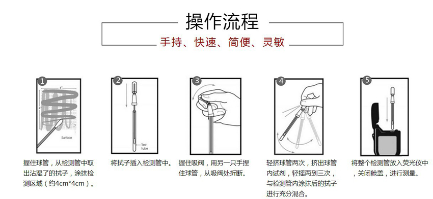ATP荧光检测仪基于萤火虫发光原理,利用“荧光素酶—荧光素体系”快速检测三磷酸腺苷(ATP)。由于所有生物活细胞中含有恒量的ATP,所以ATP含量可以清晰地表明样品中微生物与其他生物残余的多少,用于判断卫生状况。